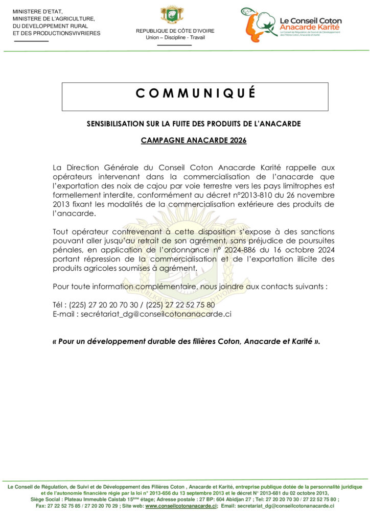 Le Conseil Coton-Anacarde-Karité invite par ailleurs tous les acteurs du secteur à se rapprocher de ses services pour toute information complémentaire et à se conformer strictement à la réglementation en vigueur.